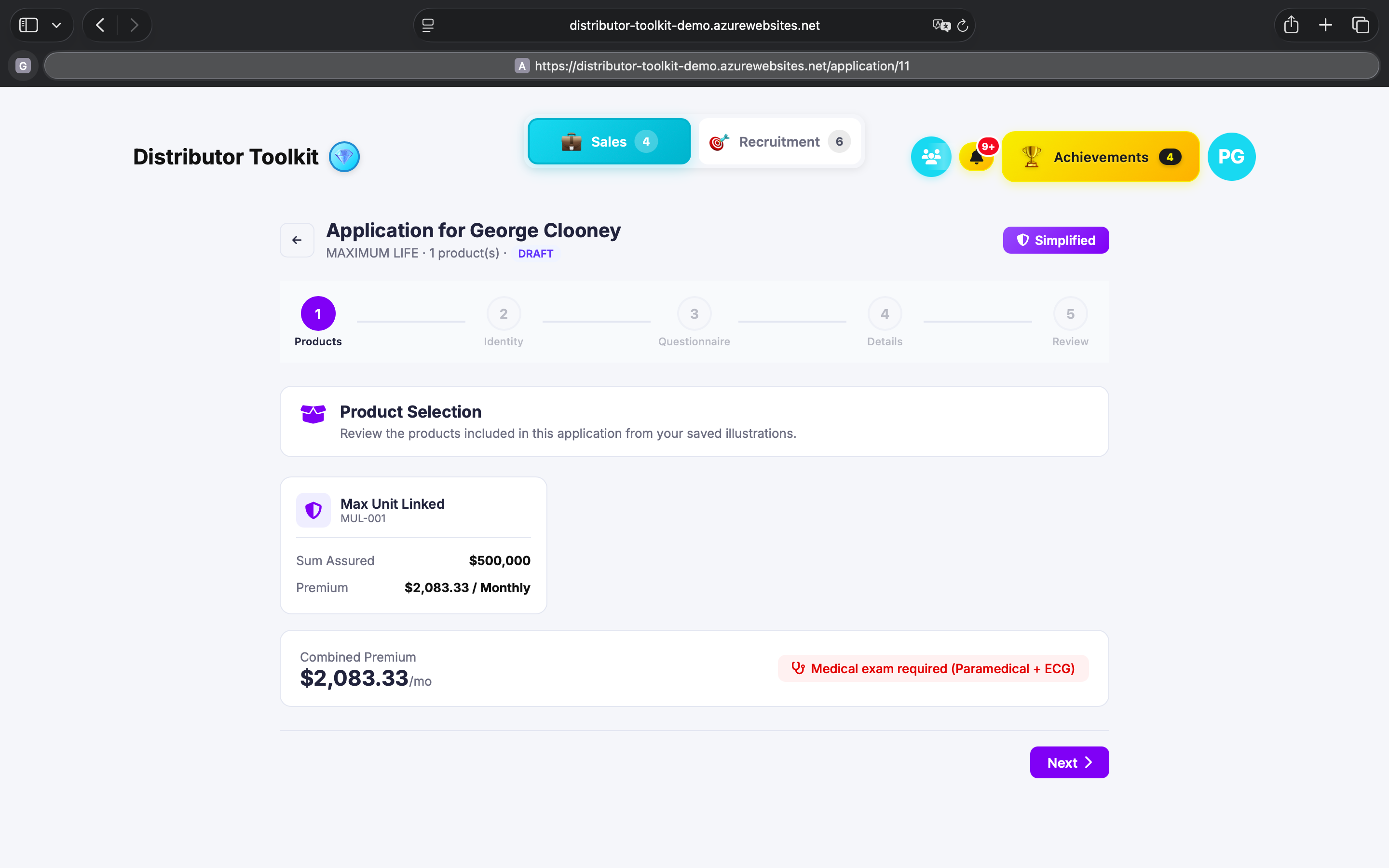 The 5-phase Application Wizard takes everything captured in discovery and illustration and carries it forward automatically. Customer details, product selections, beneficiaries, payment preferences — all pre-populated. Configurable questionnaires per product and insurer. Digital signatures.