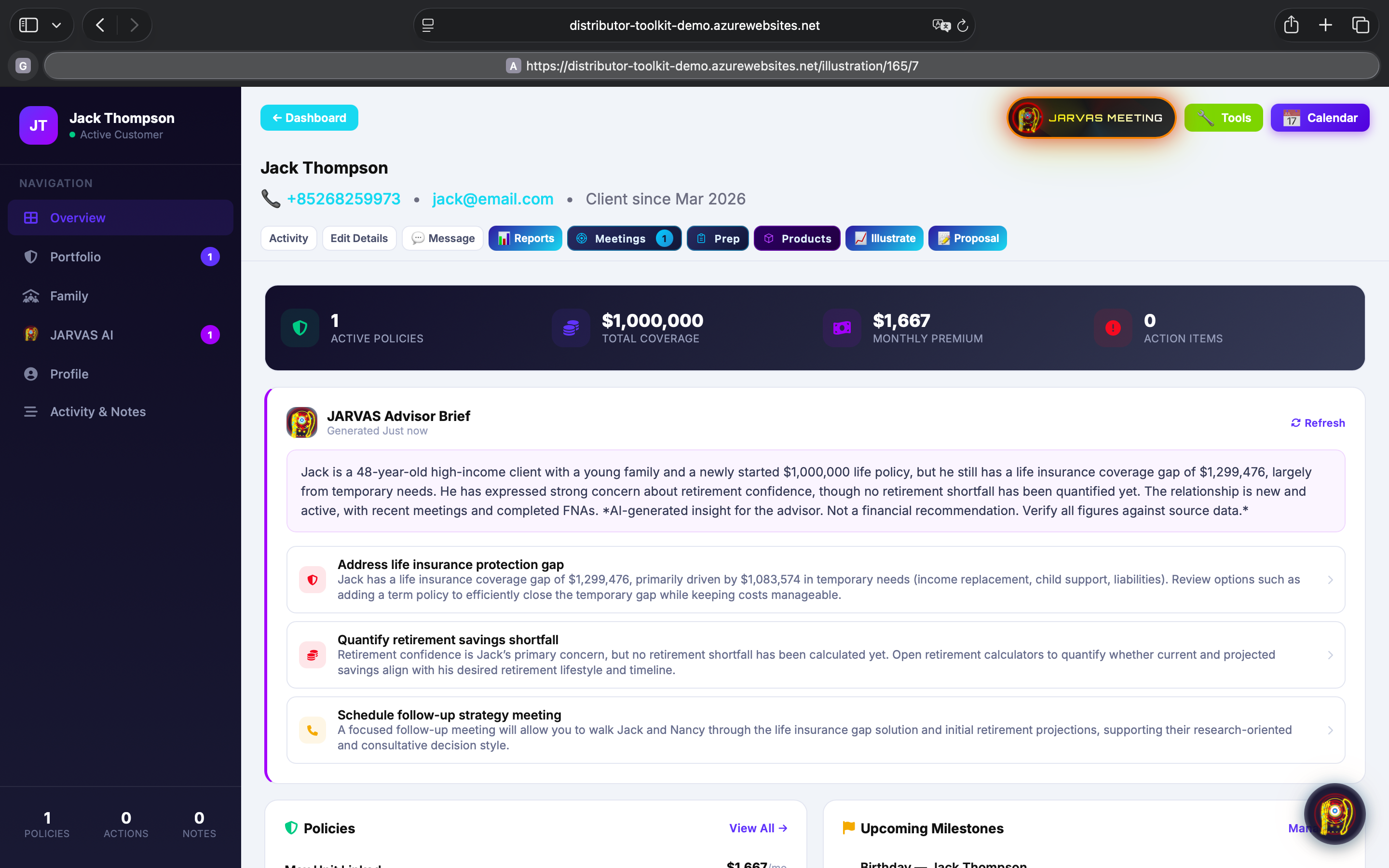 AI-led voice conversations on the customer's phone — JARVAS asks the hard questions so advisors walk in prepared