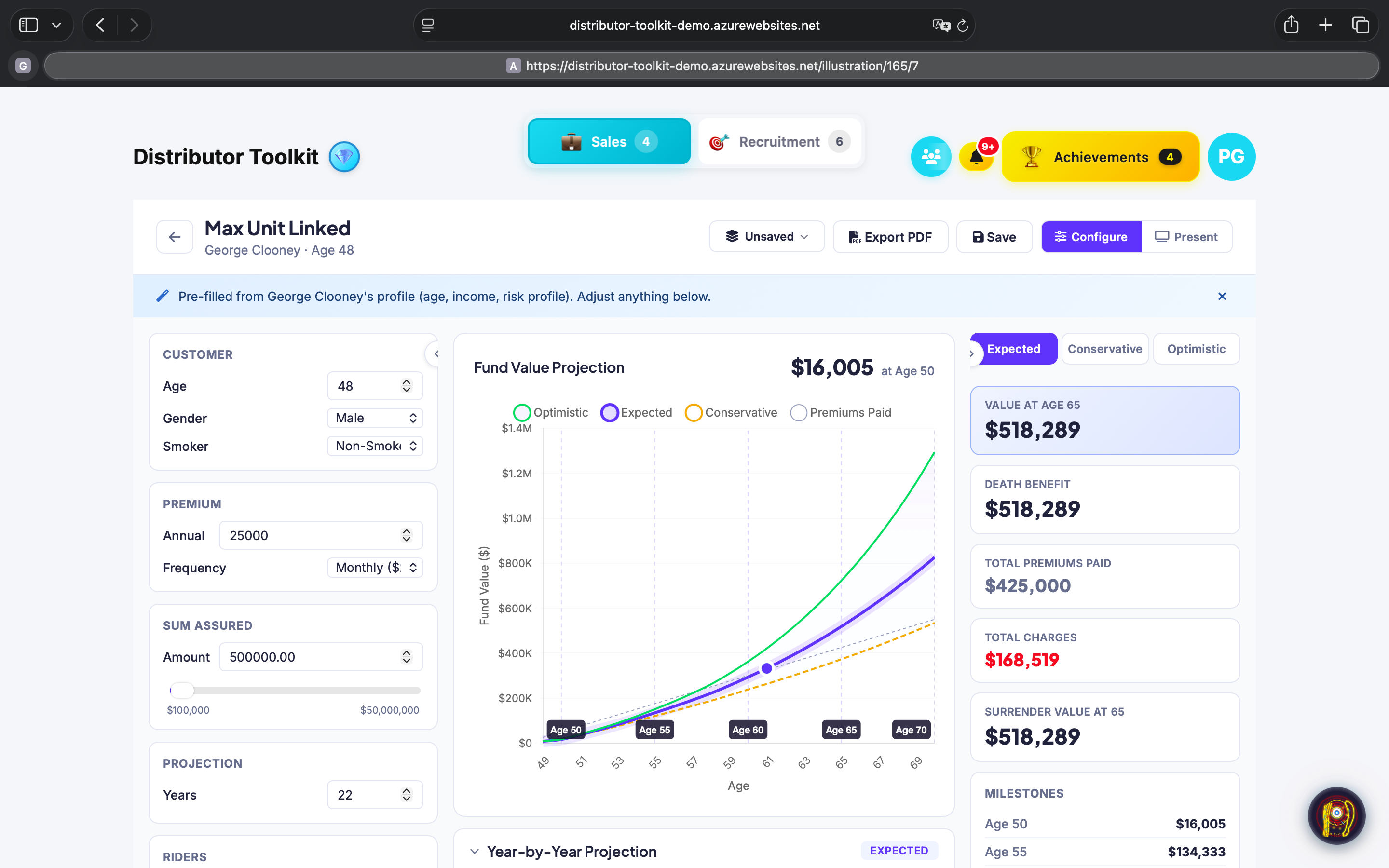 The Illustration Experience brings products to life. Real-time charts update as advisors adjust sliders. AI narration explains projections in plain language. What-if scenarios let customers see the impact of their choices. Goal-seek finds the exact premium for their target.