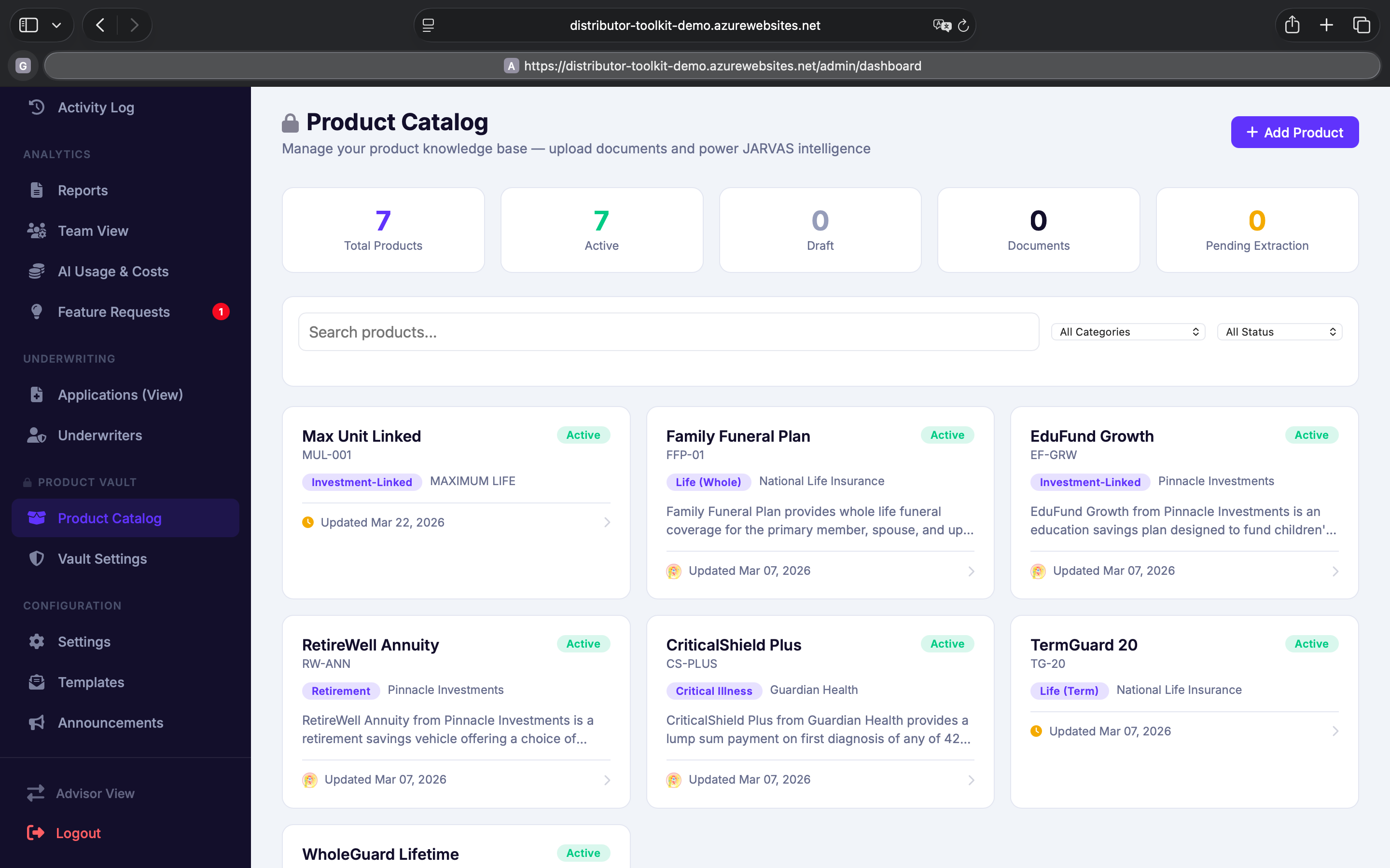The Product Vault transforms static PDFs into structured, AI-searchable product intelligence. Advisors ask questions in natural language and get accurate answers. Admin teams configure rates, benefits, riders, and funds — all feeding directly into illustrations.
