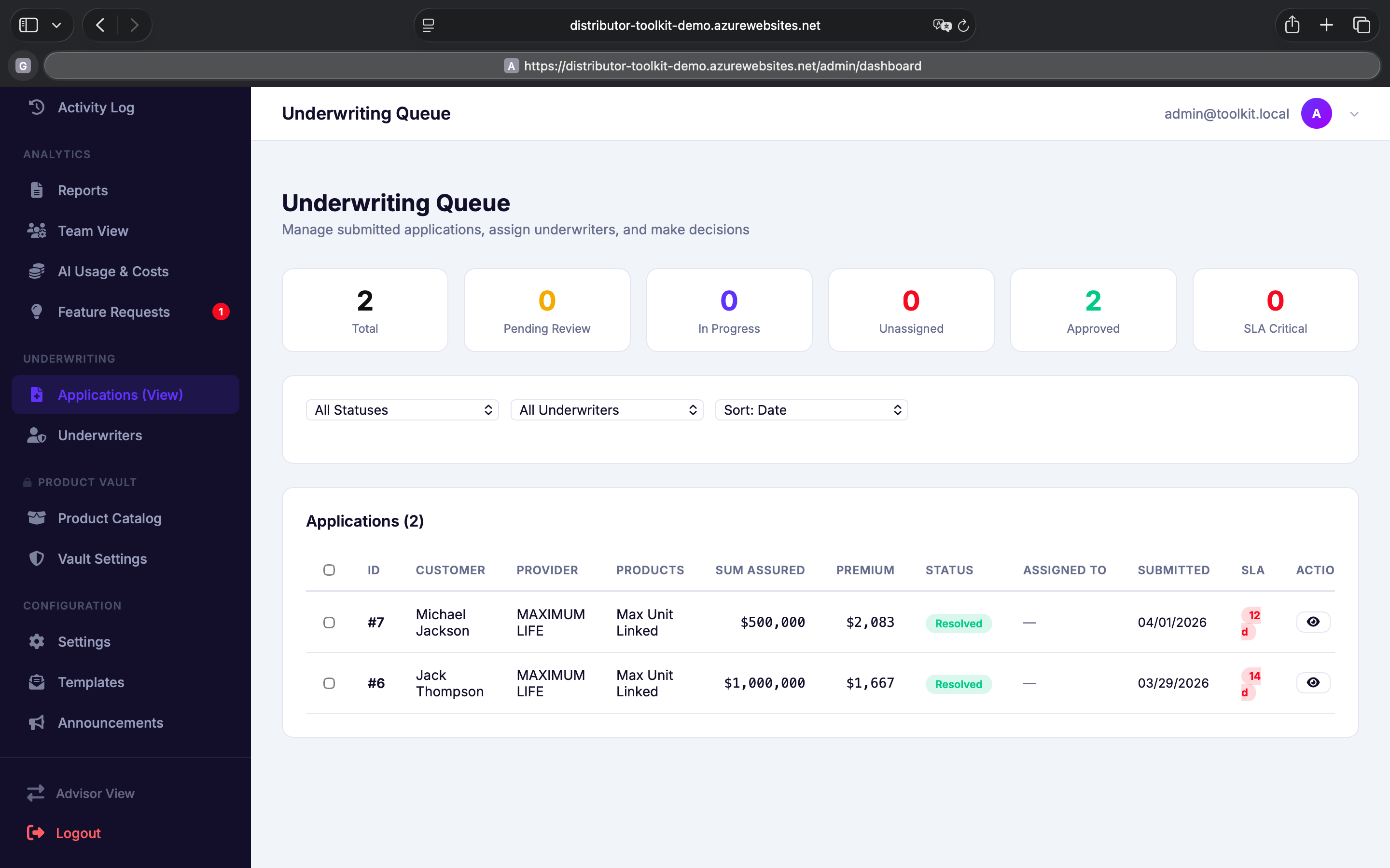 Submitted applications enter the underwriting queue with SLA tracking. Status events flow in real time — from submission through review, approval, rating, or decline. Agents see exactly where every application stands. Payment processing is architecture-ready for card payments.